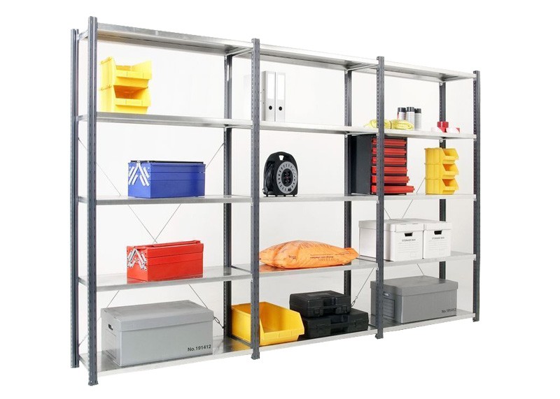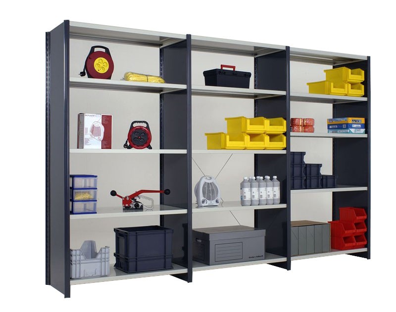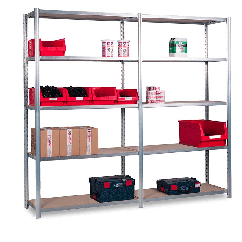 Rayonnage mi-lourd : Capacité de charge d’une demi-tonne par tablette. Convient au stockage d’outils et matériels plus encombrants et plus pesants. Plus robuste que le rayonnage léger, supporte des charges modérées