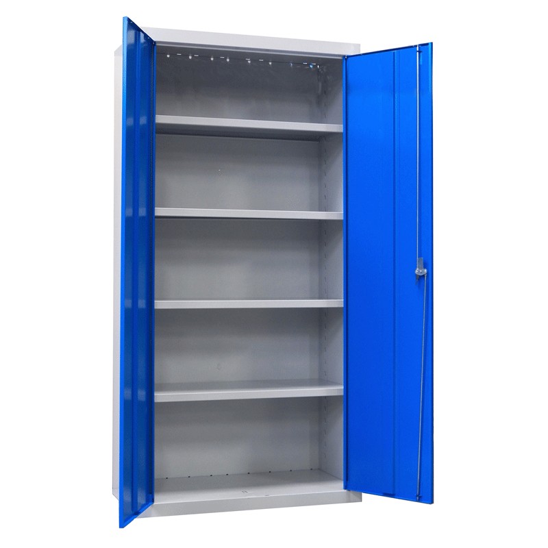 Cette armoire haute est en construction métallique monobloc d'une épaisseur de 7/10ème avec un socle traité anti-corrosion par électro-zingage sur les deux faces. Elle est équipée de deux portes battantes articulées sur pivots invisibles, indégondables en position ouverte ou fermée, renforcées par un oméga sur toute la hauteur.