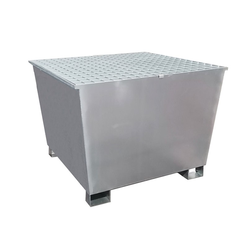 Ce bac de rétention conique est en acier galvanisé. Il est idéal pour le stockage d'une cuve debout de 1000 litres. Il est équipe de caillebotis amovible en acier galvanisé avec pieds en U d'une hauteur de 100 mm idéal pour la prise par transpalette ou chariot élévateur.