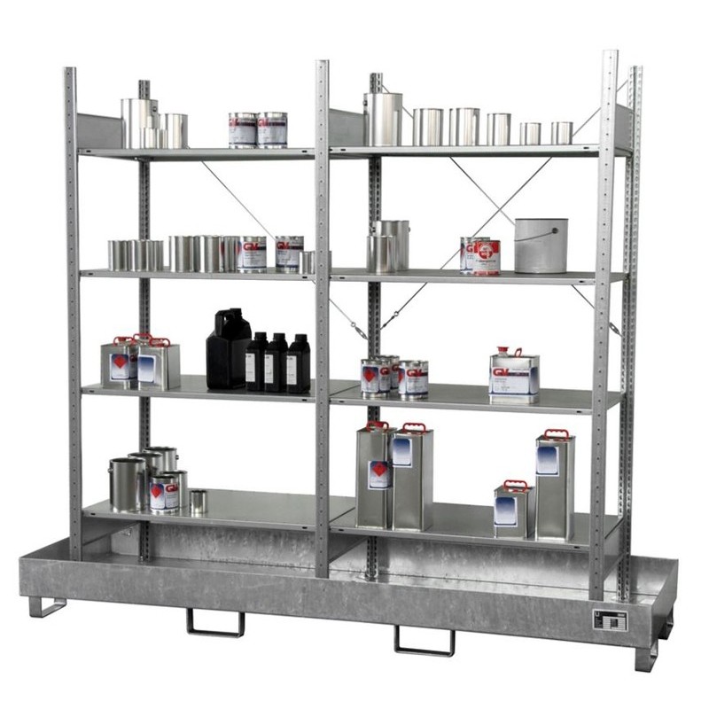 Ce rayonnage est idéal pour le stockage sûr de petits récipients. Son système est emboîtable grâce à un éléments de départ et un éléments suivant. Il est doté de 4 niveaux avec charge admissible de 150 kg en cas de charge répartie uniformément. Il est équipé d'un bac de rétention en tôle d'acier de 3 mm.