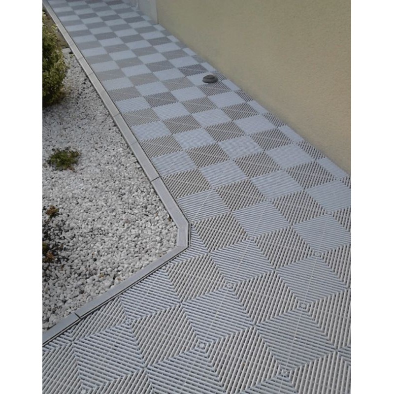 Les dalles, bordures et angles Polydal sont en polypropylène PP 100% recyclable, elles ont une stabilité aux UV supérieure à 5 ans. Avec ses stries opposées, cette dalle forme un damier qui se voit plus ou moins selon l'orientation de la lumière. Son architecture ajourée lui permet de réduire la matière, tout en restant hypersolide, et donc d'afficher le tarif le plus compétitif au m².